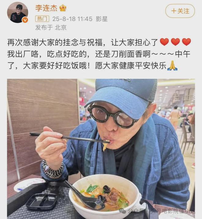 那时好友向太第一时间出来报平安:“只是一个小肉瘤,良性的,割了就没事了!”李连杰术后第二天就迫不及待跑出去吃刀削面,用实际行动证明自己“出厂”成功。